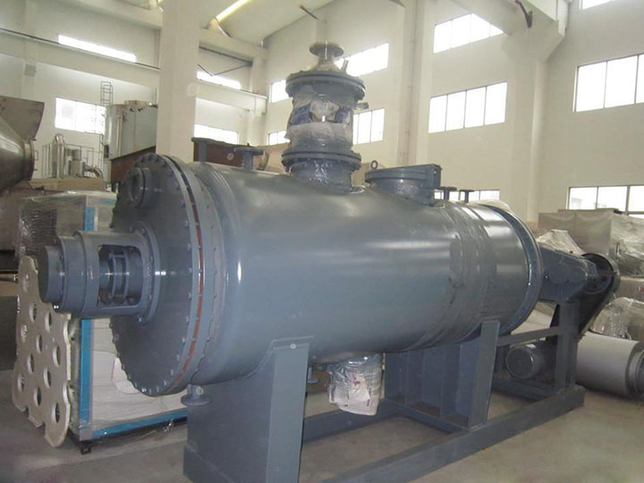 干燥機結構簡單,操作方便,使用周期長,性能穩定可靠,蒸汽耗量小,適用性能強,產品質量好,特別適用于不耐高溫、易燃、調溫下易氧化的膏狀物料的干燥,該機經用戶長期使用證明是一良好的干燥設備。原理:被干燥物料從殼體上方正中間加入,在不斷正反轉動的耙齒的攪拌下,物料軸向來回走動,與殼體內壁接觸的表面不斷新,受到蒸汽的間接加熱,耙齒的均勻攪拌,粉碎棒的粉碎,使物料表面水分有利的排出,氣化的水分經干式除塵器、濕式除塵器、冷凝器,從真空泵出口處放空。