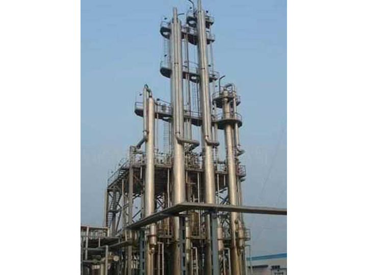 粗餾塔的工作原理為發酵成熟醪通過預熱后,進入粗餾塔中的上部,塔底不斷均勻地通入加熱蒸氣,這時由于加熱的作用就可將成熟醪中液態酒精轉變為酒精氣體,同時其它低沸點和揮發性的雜質,都成為氣態,和酒精一同進入排醛塔中(也可直接進入精餾塔),塔底將蒸餾后的廢糟排出塔外。